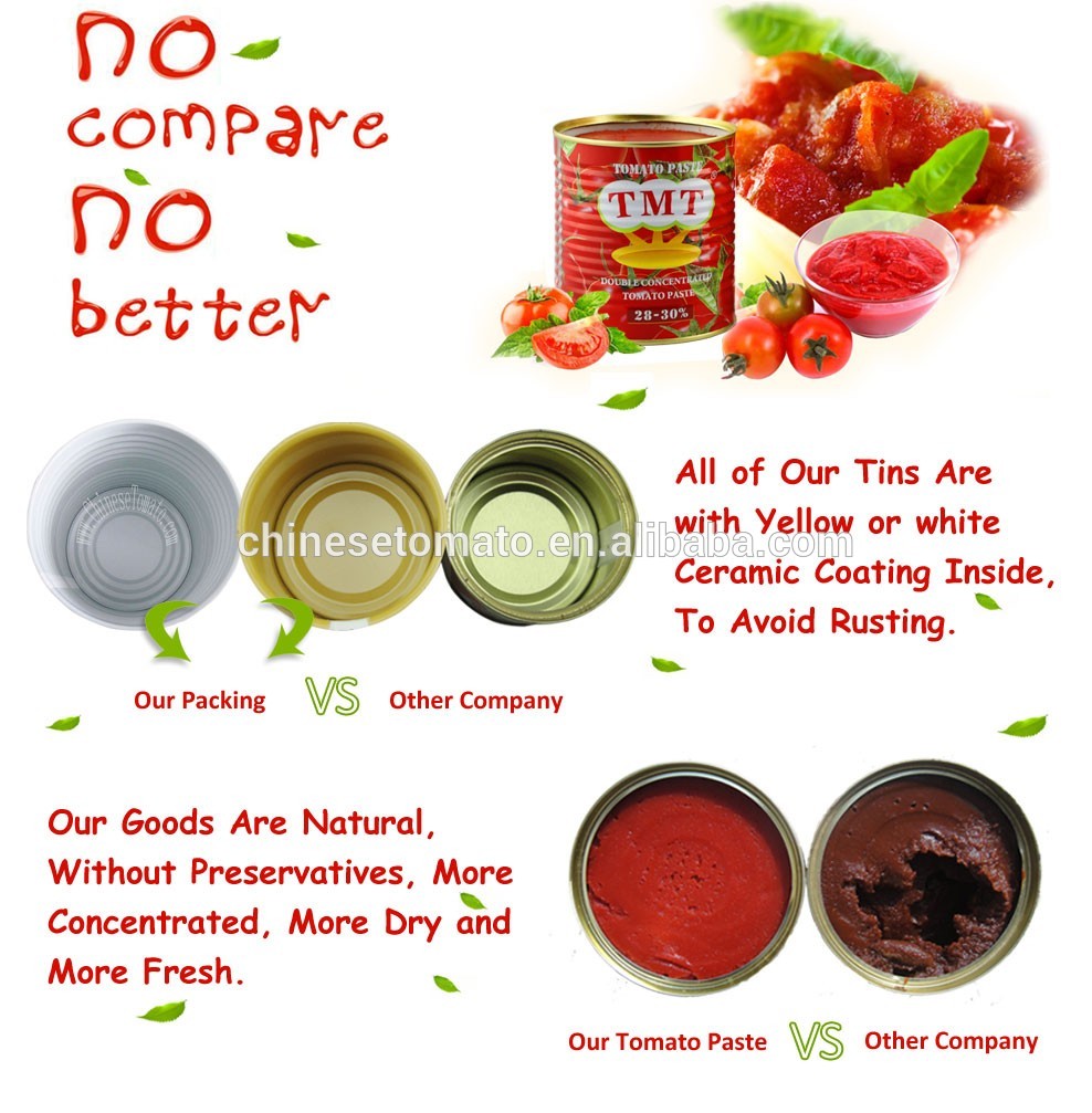 We could produce different specifications of tomato paste like canned packing 70g, 140g, 170g, 210g, 230g, 380g, 400g, 420g, 425g, 770g, 800g, 830g, 850g, 1kg, 2.2kg, 3kg, 3.15kg, and 4.5kg; Flat sachet packing 40g, 50g, 56g,70g; Standup sachet packing 50g, 56g, 70g, 140g, 200g, 400g. Our main markets are Africa, Middle East, Europe, Southeast Asia, USA, and South America countries. We can do different quality as per customers’ requests and market quality standard, the paste is normal tomatoes natural red color, 100% without additives, thick and no watery.‘Quality First’ is always our principle to process tomato paste.